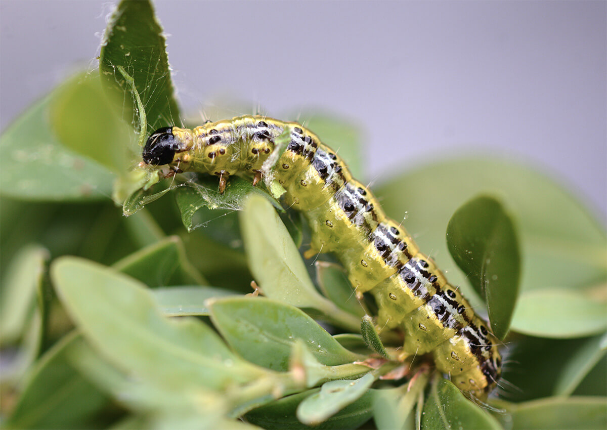 Der Buchsbaumzünsler ist ein aus Asien stammender Schädling, der Buchsbäume befällt. Die Larven fressen Blätter, Triebe und Rinde. Unbehandelt kann der Befall die Pflanze absterben lassen. Typische Anzeichen: